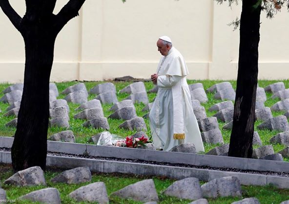 In his homily, Pope Francis said, “Here lie many victims. Today, we remember them. There are tears, there is sadness. From this place we remember all the victims of every war.”